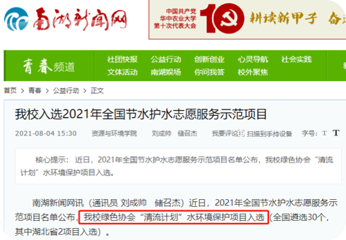 同时,广泛开展以“绿色长征”和“垃圾分类”为主题的社会实践,“绿之梦”青少年自然教育志愿服务项目入选全国100个“最佳志愿服务项目”,“清流计划”水环境保护项目获第五届全国志愿服务项目大赛银奖,“见圾行事”项目荣获第三届湖北省高校“与绿同行”微公益环保创意大赛二等奖。