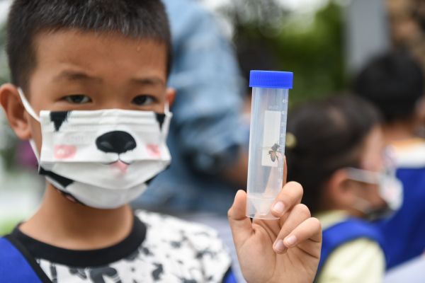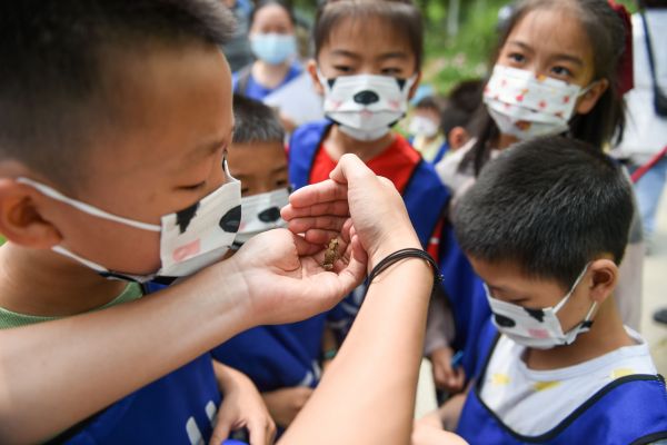 5岁半的曾姁然在父亲的帮助下,捕捉到了弓背蚁、蜜蜂、叶蜂幼虫,他说:“蚂蚁有像嘴一样的钳子,会用触角和同伴交流,看起来像‘握手’,虽然我还是有点害怕,但我们不能伤害昆虫,它们是自然中的一部分。”