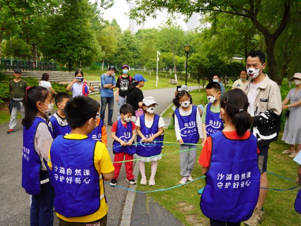 随着温度攀升,公园里的昆虫们也越发热闹,蝴蝶、蜜蜂、豆娘、蚂蚁等各类昆虫在草丛、湖边奔走忙碌,多彩的生命构成沙湖公园独一无二的自然生境。在生态系统中,每个物种都有着自己的生态位,担任着重要角色,每位同学都变身为一个自然物种,大家手持卷线,模拟自然界中的物种关系。“植物是生态系统里的生产者,吃植物的昆虫被称为消费者。”黄俊铭引导孩子们思考自己所代表的的物种在自然界中吃与被吃的关系,同学们手中的卷线交叉又折叠,循环往复几次后,化身成一张巨大的网。有的同学尝试拉了拉手中的卷线,身处其他位置的同学也感受到了拉扯感,“各种各样的物种构成自然生态,如果有一个物种消失,将牵一发而动全身,生态系统也将受到影响。”就读于武汉市梨园小学的张逸非松开手,精密的“生态系统网”瞬间塌下去一角,稳定不再。