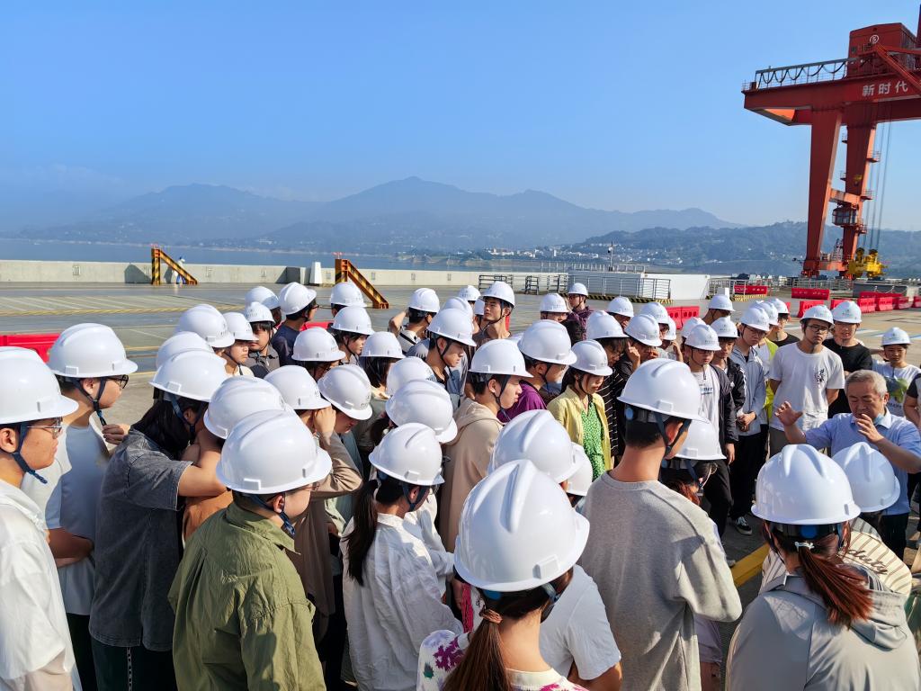 9月6日上午同学们乘坐大巴车终于来到了期待已久的三峡大坝,重走了习近平总书记2018年到访的视察路线,站立在大坝中间聆听工程师对大坝的讲解:“三峡水电站集航运、发电、种植等十余项功能于一体,是世界上最大的水里发电站和清洁能源生产基地,同时在航运方面实现‘大船走楼梯,小船坐电梯’的智慧分流。”三峡大坝作为新时代新征程的大国工程,从大坝俯瞰左岸和右岸,激动和自豪油然而生。