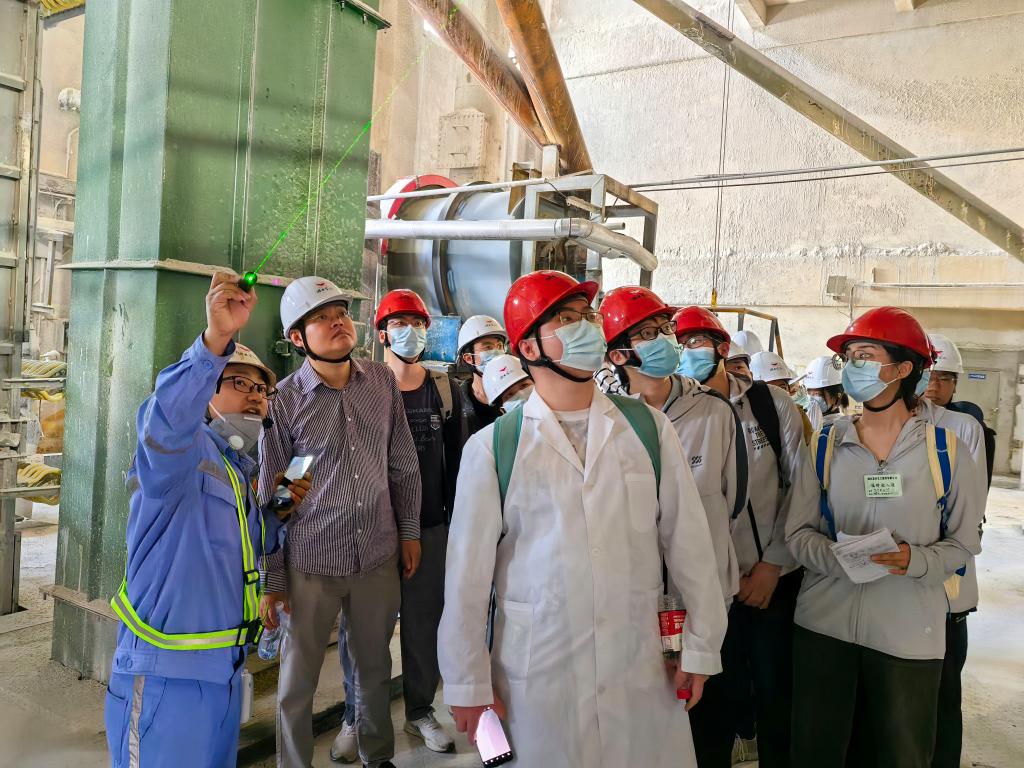 8月30 日,同学们分为三组分别进厂实习,一组前往磷酸、磷铵厂,二组前往硫酸、选矿厂,三组前往PVC厂。一组同学在蔡建波老师的带领下进厂实习,厂区负责人带领同学们详细了解磷酸、磷铵厂的工艺过程,从原料出发,到每个构筑物的详细构造、高程、工作原理,同学们都进行了深入了解;对于每个设备之间管道的走向、布局同学们仔细观察。同时,蔡建波老师让同学们用十分钟画出磷酸的尾气吸收塔设备,锻炼了同学们的动手能力。二组同学在刘广龙老师和王砚老师的带领下前往硫酸和选矿厂进行参观学习,工程师介绍该硫酸厂所用原料为固体硫磺,一进入熔硫岗位,同学们纷纷表示“气温难闻、温度太高”。工程师向同学们解释到,该工段是将固体硫磺熔融成为液体硫磺,因此会产生大量的热和气体。在选矿工艺中,工程师带领二组成员从外部观察破碎所用机器鄂式破碎机及球磨机,在鄂破机房中,会产生大量扬尘,因此在破碎机旁放置袋式除尘器进行除尘措施。三组同学在宋明伟老师和赵建伟老师的带领下前往PVC厂进行学习,在正式学习前,宋明伟老师表示同学们要从工艺过程、工艺原理、产污环节以及环保措施等方面进行重点学习,相关负责人介绍PVC厂过程中所产生的污水经处理后大部分回用至乙炔工段,乙炔工段所产生的电石渣回收存储用于新能源材料的研发。