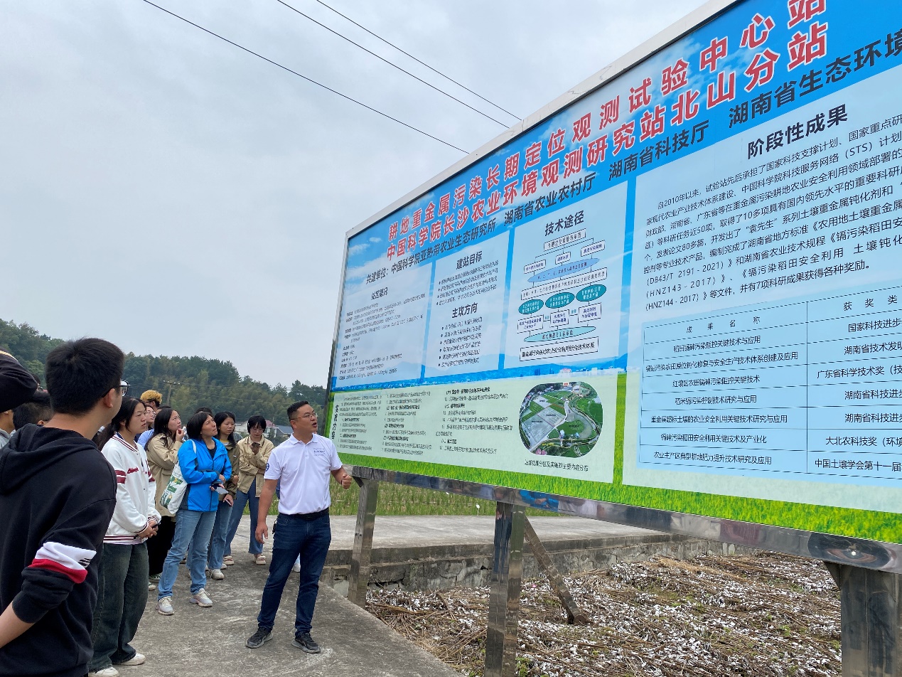 在耕地重金属污染长期定位观测试验中心站(中国科学经理沙农业环境观测研究站北山分站),朱奇宏老师向同学们介绍了站区选址原因、站区概况、建站目标等基本情况,带领同学们参观了各项技术实施内容的试验区及试验田,并详细介绍了镉污染土壤的修复治理措施及稻米镉污染控制技术等。同学们意识到解析耕地土壤重金属消长规律与迁移转化机理是漫长的过程,研发高效的可以被农民广泛接受、使用的技术与产品依旧任重而道远。