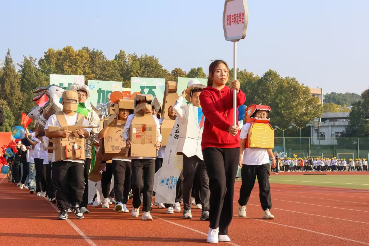 开幕式方阵最大的亮点是将废旧纸箱进行创意利用,有趣又有力地展示了资环学子将环保理念应用于具体生活的生动实践,守护绿水青山,合理利用资源,资环学子永远在路上。