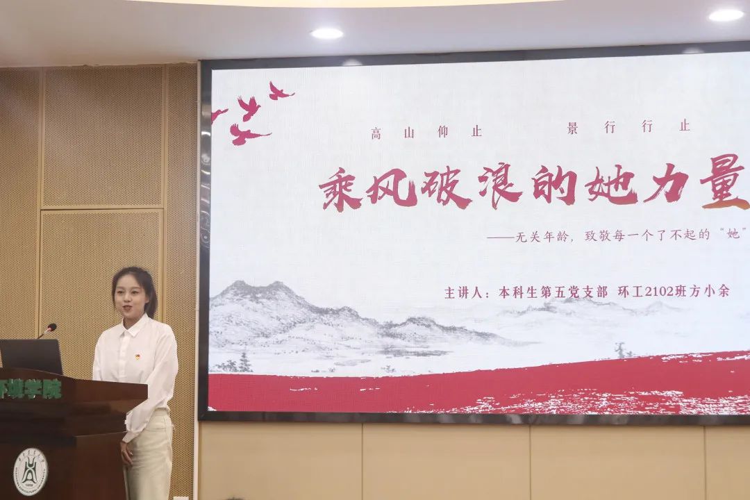 本科生第五党支部方小余以“乘风破浪她力量”为题,分享了多个中国近现代杰出女性的故事,温柔坚定的红船守望者王会悟、科学家的光辉典范何泽慧、最美巾帼奋斗者黄彩森、英雄航天员刘洋……“不论是在科技前沿、医疗战线、竞技赛场,还是在乡村大地、基层社区、创业舞台,亿万女性同胞以巾帼不让须眉的豪情和努力,创造着不凡的光辉事迹。”方小余讲到。