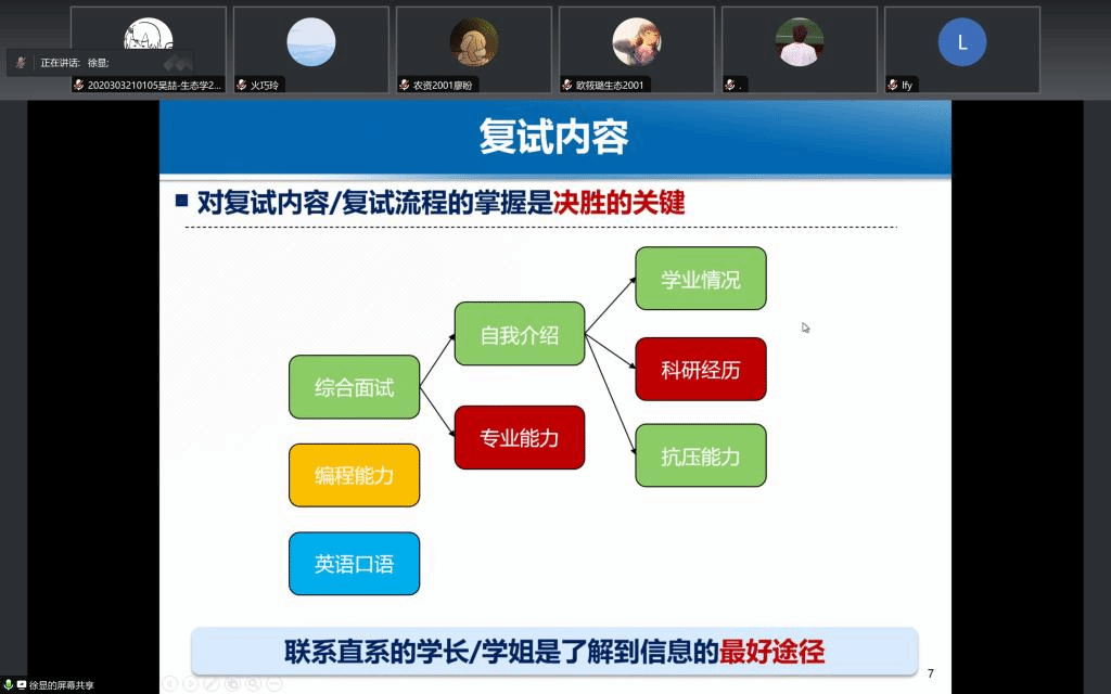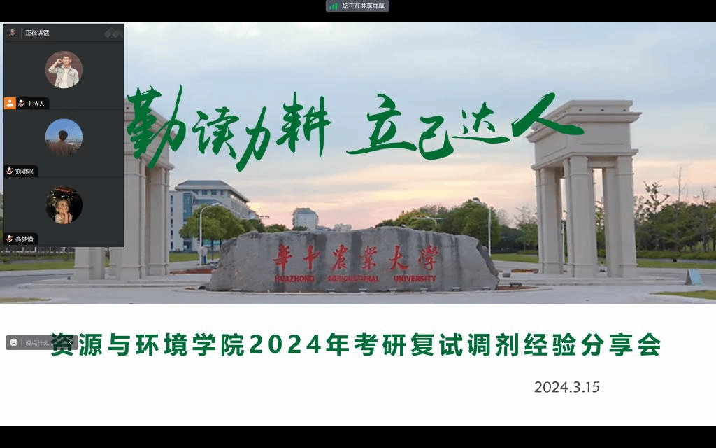 3月10日,在复试经验分享会中,殷闯闯提醒同学们在制作简历时要格外注重介绍自身科研经历,尽量清晰明了地归纳自己参与过的科创项目,有所侧重地展现工作内容;徐显建议同学们要尽早与导师建立联系,“越来越多同学本科阶段就进入实验室锻炼自我,尽早联系导师参与科研有助于早先获得心仪导师的青睐。”罗子瑶强调对于复试的英语部分,一定要准备充分,不能因为焦虑就逃避,她建议将英语对话融入日常生活,调整心理状态,熟记基础问题,复试的时候才会更从容;刘林分享了复试过程中心态调节的方法,保持自信和冷静是制胜法宝。“保持自信,相信华农的学子不会差。”他强调面试的时候一定要自信,保持好的精神面貌,大方得体地展示个人优势和华农学子的风貌。