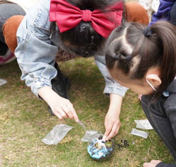 此外,柯奕青老师用罗布泊、楼兰古城的消亡史等案例,向大家分析了水资源保护的迫切性。“在生活中,用淘米水浇花、用淋浴水擦拭玻璃、洗脸水用来拖地,都是实现水环保的举措。”实践环节中,孩子们还用轻石、湿润海苔、腐殖土、植物等制作了一个个生态景观瓶。