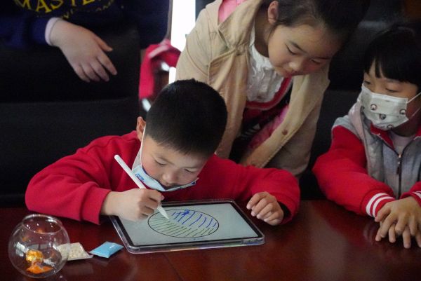 孩子们推断地球水资源的分布情况。记者詹丽 摄