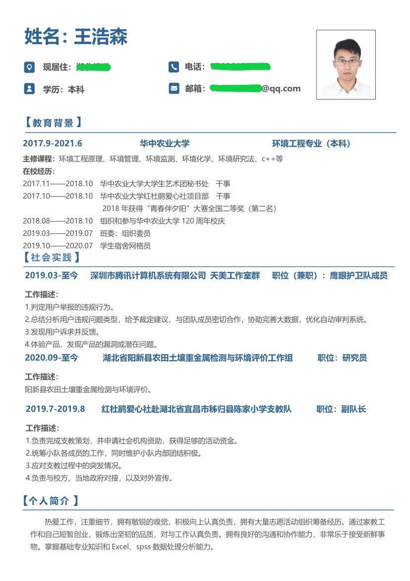 (王浩森同学简历)