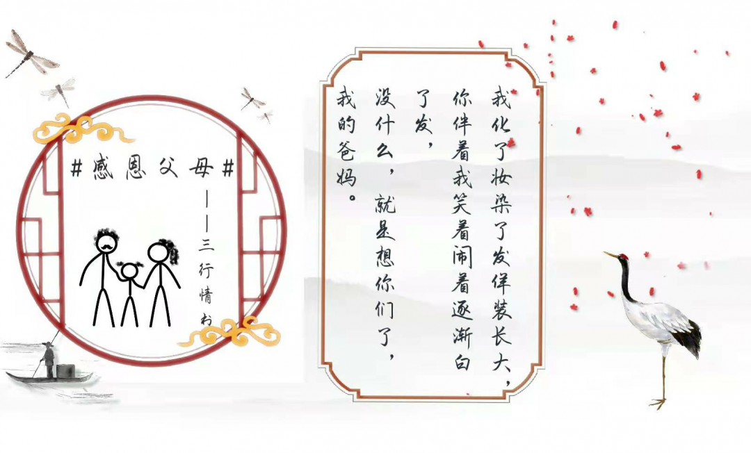 正如农资1902班的黄华盛所写“从前你见过世间万物美好,可有了我之后,所有美好都向我倾斜”。是的,父母也曾像我们一样年少,见识过许多事物,也或许有过自己的梦想或抱负,但有了我们之后,他们可能放弃了很多,却尽他们最大的努力,将所有的美好都呈现给我们。这短短三句,已然诉尽心中感动。