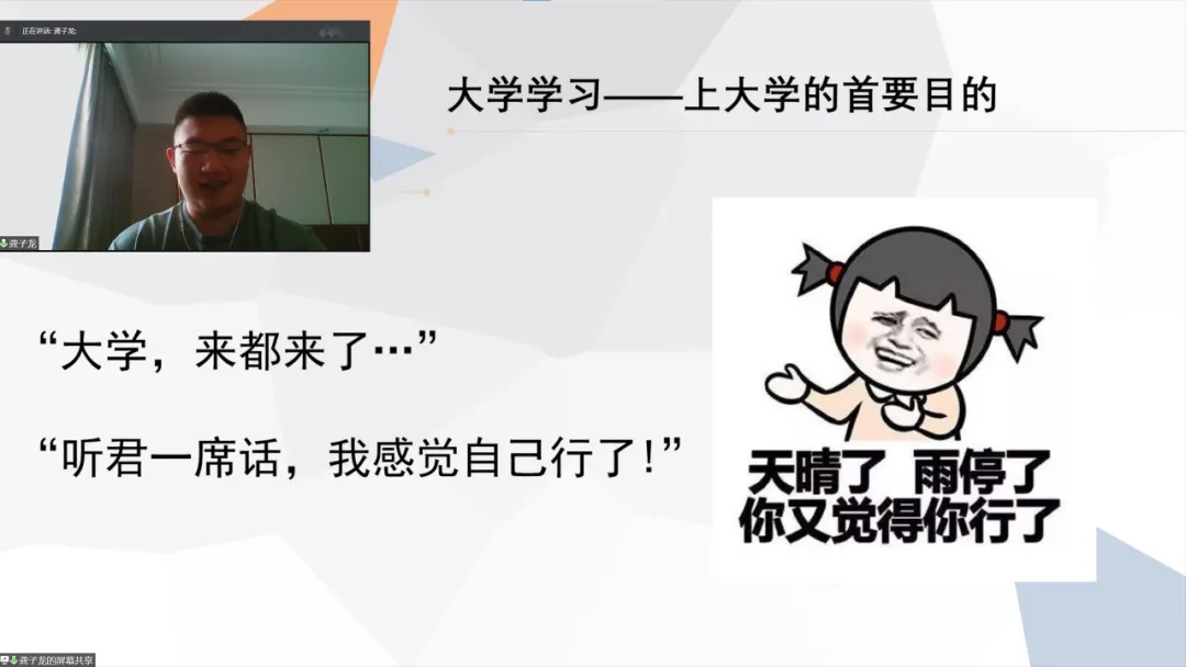 9月4日上午,公司本科线上学涯分享会圆满举办。本次分享会旨在引导公司2021级本科新生对大学学习生活形成初步认识,助力其校园生活顺利起航。会议由环生1801班龚子龙,农资1801班刘嫒桦和地信1802班姜卓攸三名同学主讲,他们结合自身经历,从学习科研、员工工作、业余生活等方面展开分享。2021级辅导员甄诚、全体新生及部分家长代表参加了本次活动,会议由院团委副书记简安仡主持。