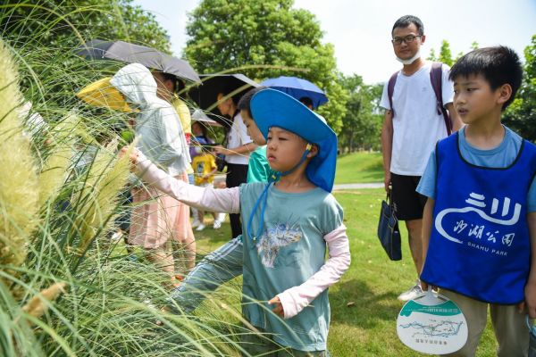 同学们观察竹叶的形状。 许魏巍 摄