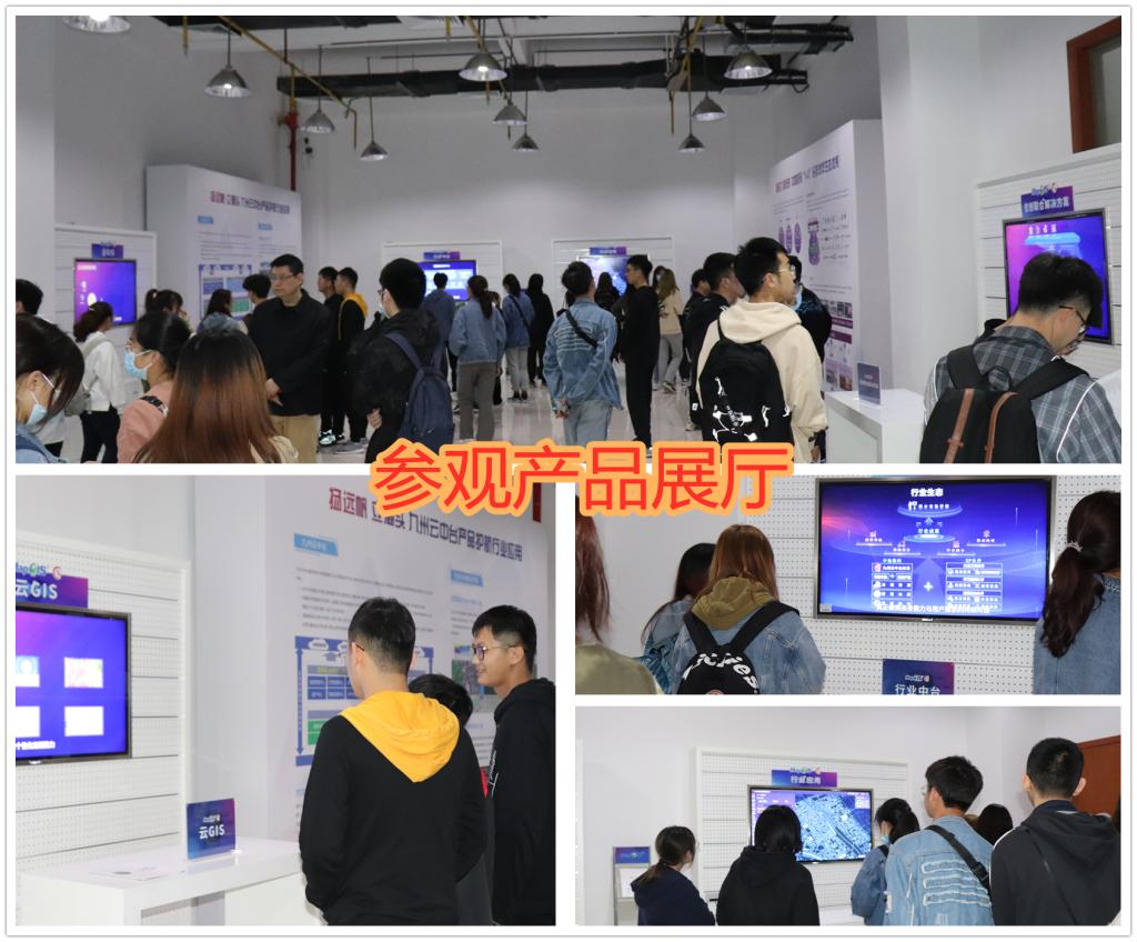 活动伊始,方胡朝带领师生参观了中地历史文化馆和MapGIS产品展厅,详细地讲述了中地数码三十多年来的发展历程及国产GIS自主创新成果和所获荣誉。自成立以来,中地数码坚持自主创新,目前已拥有集地理信息系统研究、开发、应用、服务为一体的产业链,现已成为国内地理信息产业的龙头企业。